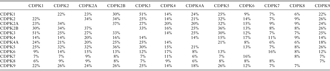 Table 1. The protein sequence identities between the 12 putative calcium-dependent protein kinases (CDPKs) of T. gondii, rounded to the nearest whole number, derived from a multiple sequence alignment (MSA) generated using Clustal Omega (Sievers et al. Reference Sievers, Wilm, Dineen, Gibson, Karplus, Li, Lopez, McWilliam, Remmert, Söding, Thompson and Higgins2011)