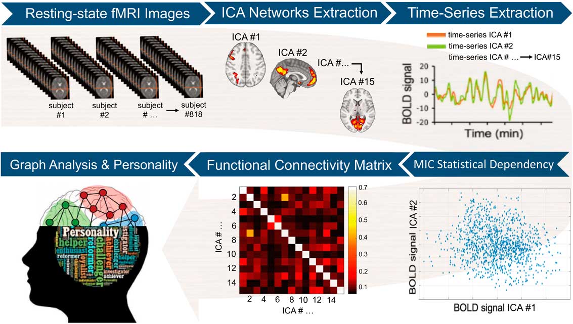 Figure 1 Image analysis workflow. After initial pre-processing, the resting-state functional magnetic imaging (fMRI) data were used to extract a set of 15 separate brain circuits via independent components analysis (ICA). Next, participant-specific time-series from each ICA brain circuit was obtained. The maximal information coefficient (MIC), an index that assesses for linear and nonlinear relationships in big data-sets, was used to measure statistical dependency between each pair of time-series. This led to a 15×15 functional connectivity matrix at the single-participant level. The participant-specific connectivity matrices were then used to compute local and global graph measures (i.e., strength, clustering, efficiency, and betweenness centrality). Each of these graph measures, which quantify different aspects of the brain topological organization, was finally correlated with the five-factor model personality traits at the group level. BOLD=blood-oxygen-level-dependant activity.
