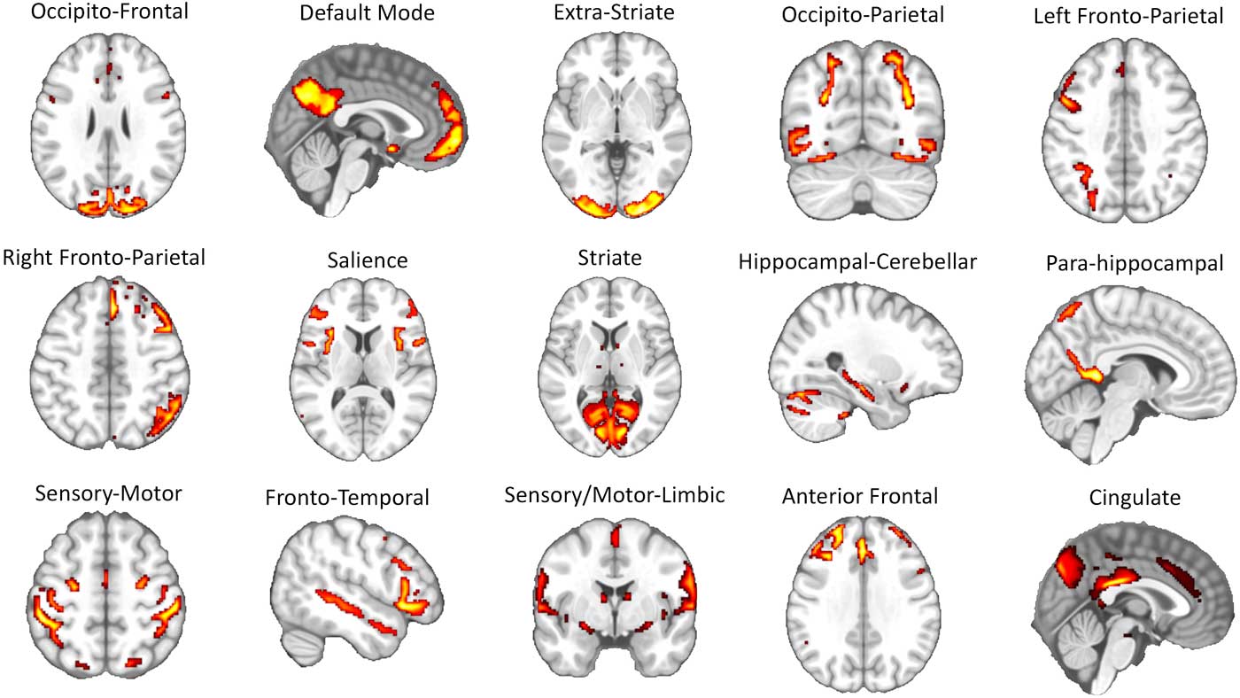 The 15 brain networks identified via ICA were represented by a series of circuits that have been consistently reported in past rs-fMRI studies (e.g., the sensory-motor circuit, visual circuits, DMN, left and right fronto-parietal circuits, salience network, etc.) (Raichle, Reference Raichle2015; Toschi, Duggento, & Passamonti, Reference Toschi, Duggento and Passamonti2017) (see Figure 2 and Supplementary Table 1 for the list of the anatomical regions involved in each network node).