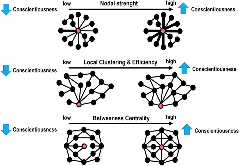 The higher nodal strength in the left FPN in people scoring high in conscientiousness reflects the fact that this specific circuit “node” has heightened “communications” with the other nodes. Highly conscientious people also show higher local clustering in the left FPN, which implies that the FPN is densely interconnected to its neighbours and formed an elevated number of local aggregates (“triangles”) with its most adjacent nodes. At the same time, the local efficiency in the left FPN and the betweenness centrality in the right FPN were higher in people scoring higher in conscientiousness.