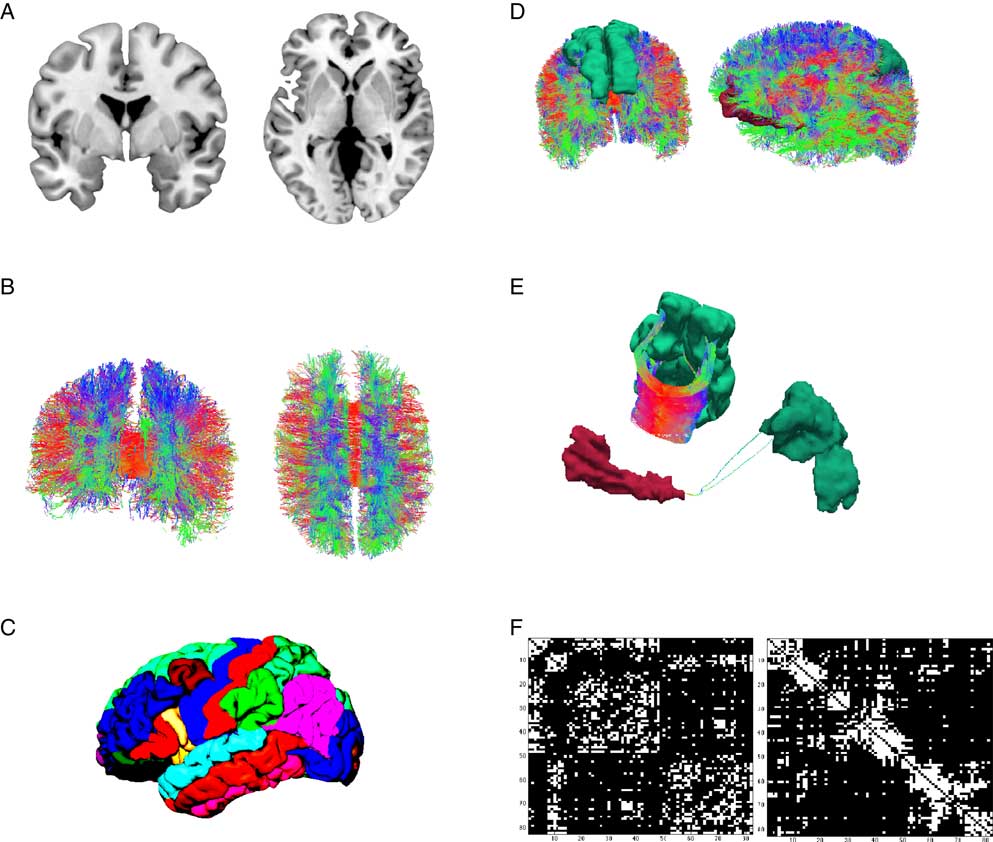 Figure 1 Illustration of the workflow of connectome reconstruction. A connectome combines information from cortical gray and white matter (A). Diffusion imaging and computational reconstruction methods are applied to obtain a detailed map of white matter fiber connections (B). The cortical ribbon is parcellated into a set of non-overlapping regions of interest, (C) illustrates Freesurfer’s Desikan-Killiany atlas. Connectome reconstruction combines the information from (B) and (C) and determines whether two ROIs are touched by any white matter fibers or not. (D) Shows two examples: the left and right superior frontal gyrus (left) are densely connected (E, left) while the left medial orbitofrontal and superior parietal gyrus (D, right) are only sparsely connected (E). Results can be displayed in a connectivity matrix. Rows and columns are regions of interest from the whole brain parcellation. Matrix elements indicate the presence (white) or absence (black) of a connection (F). The left matrix groups brain regions according to hemisphere and cortical vs. subcortical, the right matrix according to their allegiance to network modules.