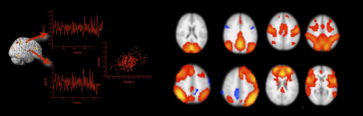 Figure 3 Functional connectivity from blood oxygen level dependent (BOLD) functional magnetic resonance imaging is estimated by correlating the extracted BOLD time series from regions of interest or single voxels (left panel). The right panel shows prominent resting-state functional connectivity networks as revealed by independent component analysis (data courtesy of the authors). The networks in the top row correspond from left to right to the visual, the default mode, the somatomotor, and the dorsal attention network. The networks in the bottom row correspond to the left and right fronto-parietal, the frontal, and the salience network. All networks are displayed in radiological convention (left is right).