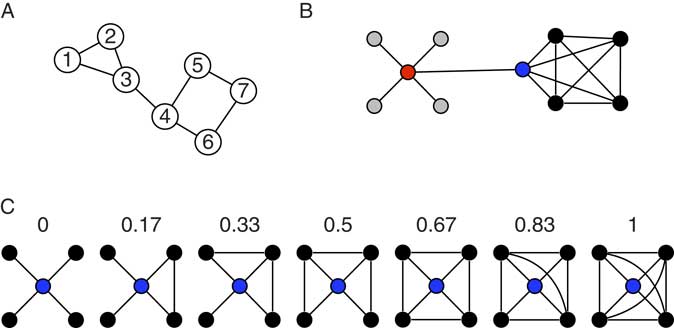 Figure 4 Toy networks for the illustration of measures from network theory. The global efficiency of a network can be quantified by its characteristic path length (CPL). CPL is the average of all shortest path length in a network. The shortest path between any two nodes in a network equals the minimum number of edges that have to be transversed to reach one node from the other. In the network in (A), the shortest path equals 1 between node 1 and node 2, equals 2 between node 1 and node 4, and 4 between node 1 and node 7. The CPL of the network is 2.0476. The toy graph in (B) illustrates degree centrality and betweenness centrality. Degree centrality of a node equals the number of its connection to other nodes. The gray nodes have a degree of one, the black nodes a degree of four, and the blue and red node a degree of 5. In general, it is assumed that high degree nodes are more important for the network as a whole. Betweenness centrality is a further centrality measure that can capture different information on the importance of a node. Betweenness reflects the amount of shortest paths between any two nodes that travel through a given node. The red node, for instance, has a higher betweenness than the blue nodes (even though they have the same degree). All shortest paths between any gray and any black node travel through the red and the blue node, however, all shortest paths between any two black nodes travel through the red but not through the blue node, hence its higher betweenness. The networks in (C) illustrate the clustering coefficient, which is regarded a measure of local efficiency. The numbers indicate the clustering coefficient for the red node in the network. The clustering coefficient gives the ratio of neighboring nodes that share a connection themselves over the total number of connections that neighbors could share. In the first graph, none of the black nodes (the neighbors) share a connection, hence the clustering coefficient of 0. In the last network, all neighbors are directly connected to each other (six connections between neighbors), hence the clustering coefficient of one.