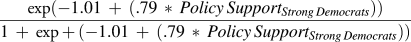 To evaluate this expectation, I again utilize Gilens' data, and I estimate the probability of policy adoption given the preferences of Strong Republicans and Strong Democrats. I focus on strong partisans because these individuals allow us to observe patterns of relative policy support that are most likely to be distinct. The analysis is limited to survey questions that were asked between 1999 and 2002 because this is the period for which the preferences of strong partisans are available in the data (the proposed policies, if adopted, became law between 2000 and 2004). Footnote 38 In these surveys, 15.5 percent of respondents identified as Strong Democrats and 19.6 percent indicated they were Strong Republicans. Given the partisan sorting in the electorate, not surprisingly, we observe much less overlap in the preferences of Strong Democrats and Strong Republicans than we observed with middle- and high-income groups. The overall correlation between the percent favoring policy change among Strong Democrats and Strong Republicans is r=0.43. When these groups' preferences differ by at least 10 percentage points, the correlation drops to r=0.21.