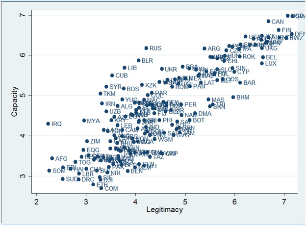 As a first step in applying the framework, think of each state’s existence as the length of time between birth and death. Every state’s goal is to maximize this duration by enhancing survival. What helps them do so? My reading of the state-making literature suggests that capacity and legitimacy are the important means to extend the life of the state. Capacity and legitimacy are complements because high-capacity states govern better, which enhances their legitimacy, and legitimate states enjoy an easier time governing and extracting resources.