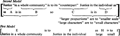 2 According to the Encyclopaedia Britamica (1963, s.v. “Analogy”, 842), the early Greek concept of an analogy was based on its derivation (ana logon, “according to a ratio”) and meant a “similarity in proportional relationships” (on the model of: as A is to B so C is to D), and it was not until later that an analogy came to be thought of in the sense of a “similarity of function performed by two elements in their respective contexts” (on the model of: as A is in B so C is in D). Cf. Robinson, Richard (Plato's Earlier Dialectic, London: Oxford, 2nd ed., 1953, p. 209Google Scholar) who says that when Plato speaks of analogy it means “the same as his phrase ‘geometrical equality’” or mathematical proportion and doesn't get extended outside mathematics until Aristotle. I don't want to claim a fundamental distinction between “in” and “to”, but the two models may help bring out the assumptions of Plato's procedure. From the passage, it would appear that Plato's analogy follows the first model with justice being present in “larger proportion” and its counterpart being on a “smaller scale”. The plan of finding justice in the state and looking for its “counterpart” in the individual, however, is more on the second model.