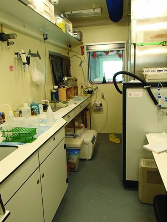 Lab 3 was used by a research group studying the flux of dimethylsulphide and brominated compounds from sea-ice to surface ocean. The western Antarctic Peninsula is among the most rapidly warming areas on Earth (Meredith & King, Reference Meredith and King2005; Vaughan et al., Reference Vaughan, Marshall, Connolley, Parkinson, Mulvaney, Hodgson and Turner2003) and besides warming of the ocean surface the sea-ice is declining (Stammerjohn, Martinson, Smith, & Iannuzzi, Reference Stammerjohn, Martinson, Smith and Iannuzzi2008). Use of lab 3, with the specially built-in incubation cabinet and the mass spectrometer in combination with stable isotopes, allowed for direct biosynthesis measurements.