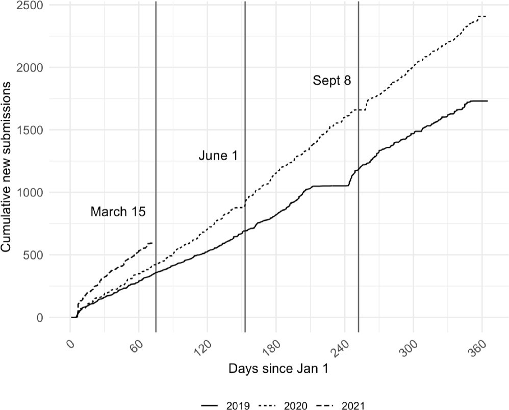 Figure 2 Cumulative New Submissions by Calendar Year, 2019–2021