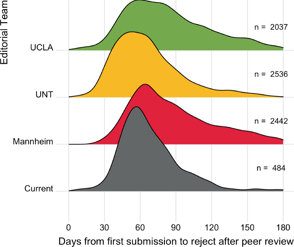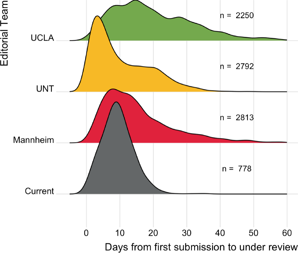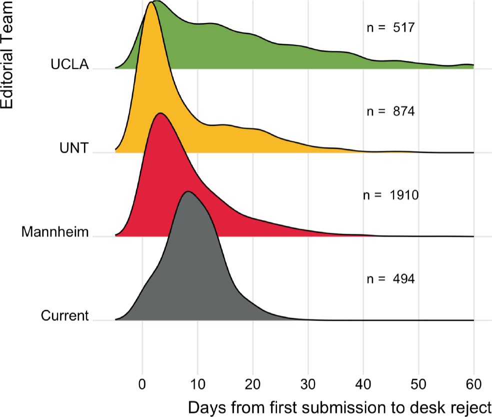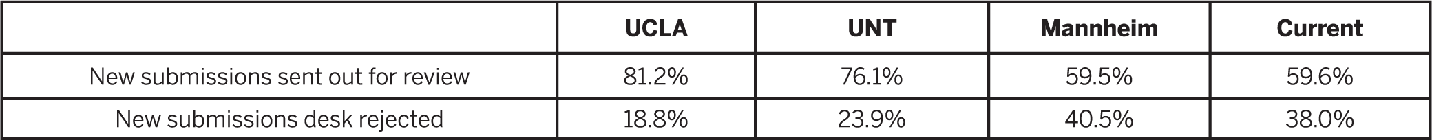Our editorial team’s overall rates of desk rejection are also fairly similar to the prior team, but higher than the UNT and the UCLA team’s desk reject rates (table 2).