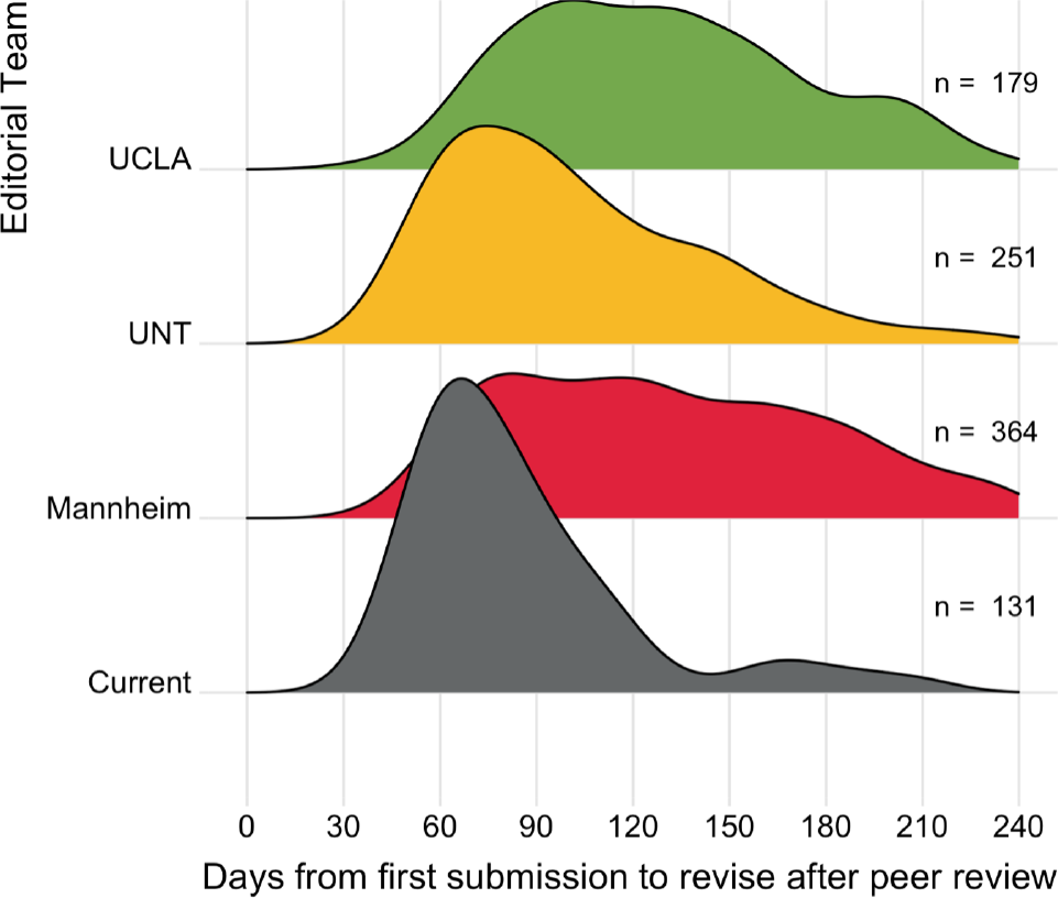 Figure 4 shows days from first submission to reject after peer review for our team and the three teams that preceded us. Figure 5 shows days from first submission to revise after peer review. Both figures 4 and 5 include only manuscripts with completed decisions.