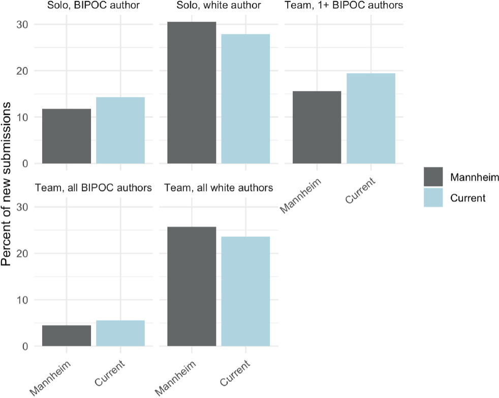Figure 9 shows the distribution of authors’ self-identified race or ethnicity. Specifically, it shows whether authors identify as white or Black, Indigenous, or another racial identity and, in the case of teams, whether at least one, but not all, authors identify is BIPOC (1+BIPOC). Comparing our team with the Mannheim team, we note a slight increase in solo BIPOC, BIPOC team, and 1+BIPOC submissions.