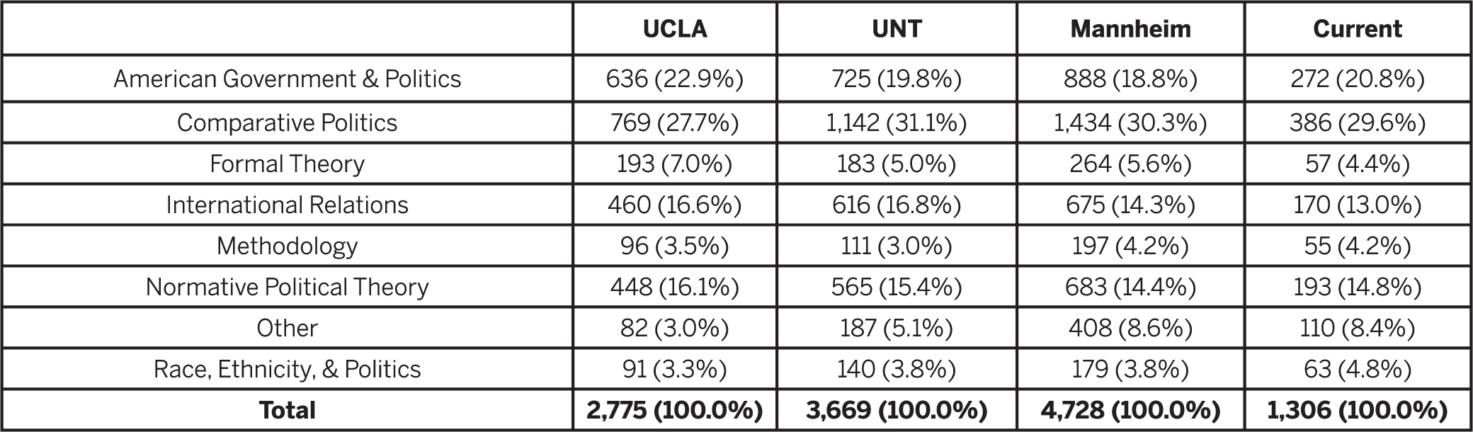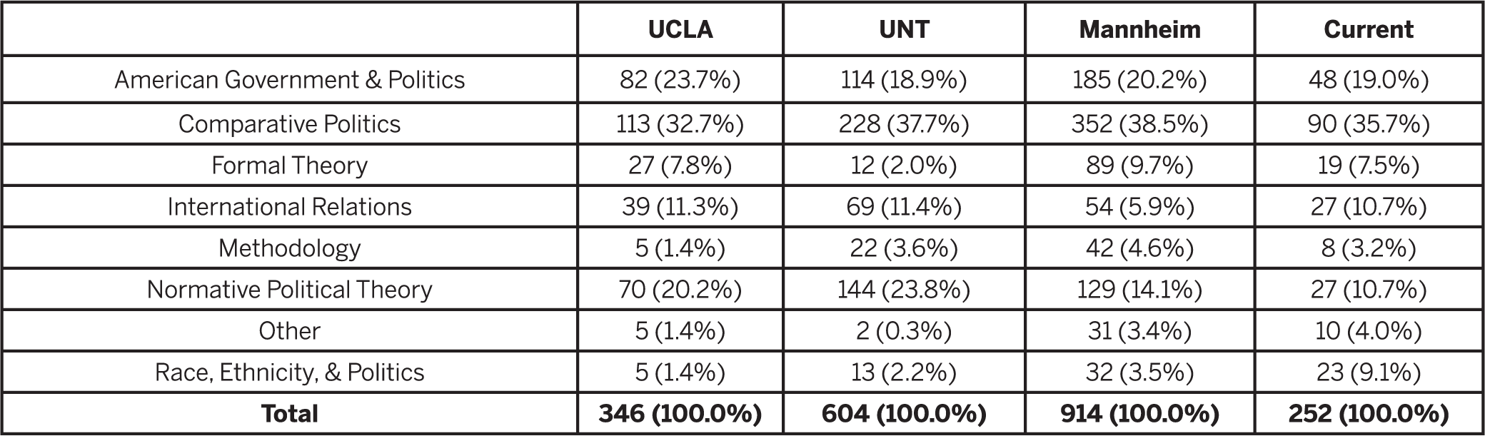 Also worth noting is that, although examining the category for normative political theory defined as a section suggests that acceptances in that subfield are down (table 4), according to subfield classification in the author questionnaire, political theory acceptances are up from 10% to nearly 15% (table 6).