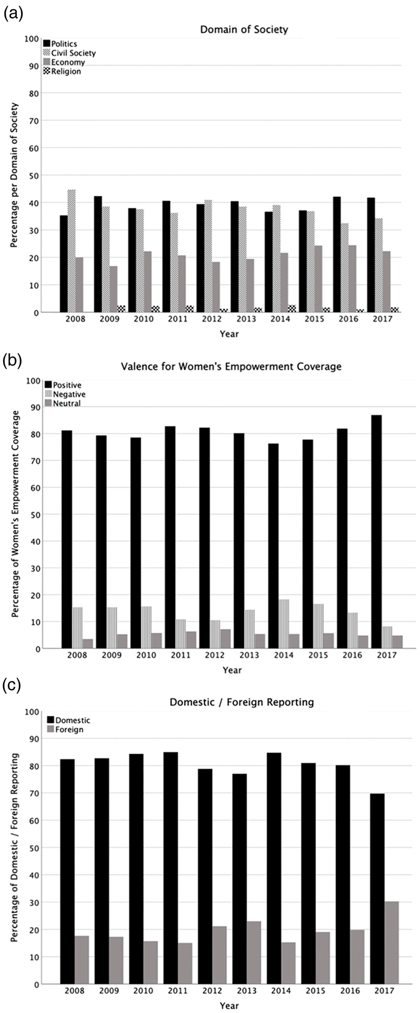 First, we ask, In which arenas of society (politics, economy, civil society, religion) has women's empowerment predominantly been addressed through the media? By questioning sectorial diversity, we aim to understand whether the discussion of women's empowerment is limited to a certain social domain or incorporates all arenas of society. Given the region's absolute monarchical institutions, we expect that women's empowerment topics will predominantly be discussed in the realm of politics and that sectorial diversity is low.