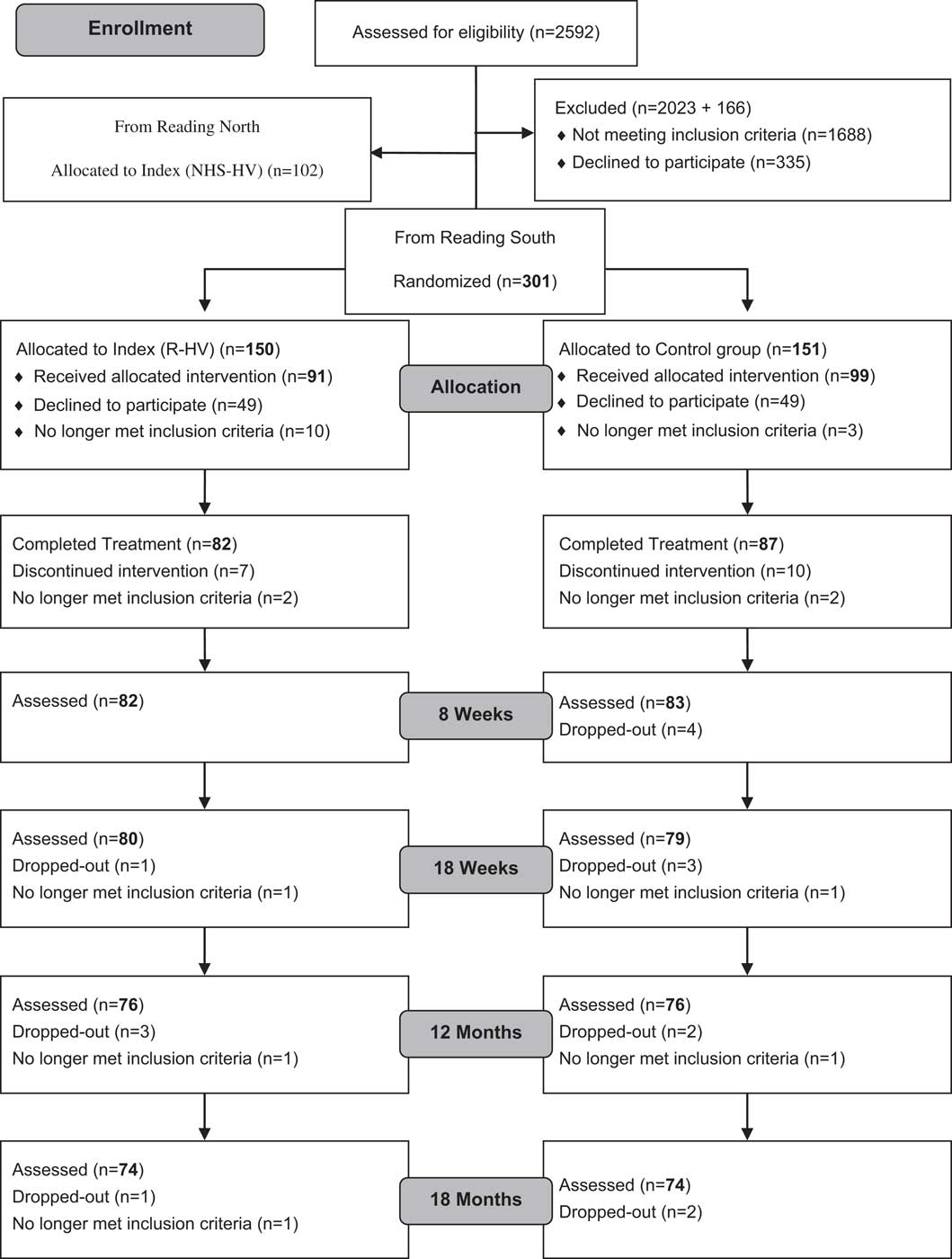 The study was conducted in Reading, Berkshire. In one area, corresponding to the southern half of the city (Reading South), an efficacy, randomised controlled trial (RCT) was conducted; that is, appropriate women were identified (see Sampling section below) and assigned by simple randomisation, using consecutively numbered, opaque, sealed envelopes, to either routine primary care, or to an index preventive condition delivered by research health visitors (R-HV) (see Intervention and therapists section below).Footnote 1 In the northern sector (Reading North) there was no randomisation. Instead, all appropriate women were identified and treated by their local NHS health visitor (NHS-HV) who had been trained to deliver the intervention (see Intervention and therapists section below). Assessments were made at eight and 18 weeks postpartum, and at 12 and 18 months postpartum.