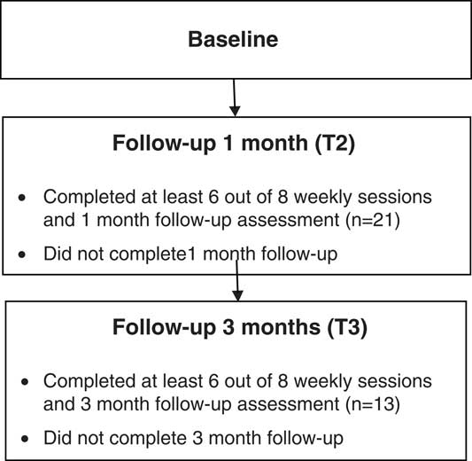 Table 3 shows outcome scores at each survey for participants who completed all follow-up assessments. Personal accomplishment scores at T2 showed larger increases from baseline (mean change=3.62, n=13) when compared with all participants (mean change=2.33, n=21) who completed the first follow-up assessment. In addition, there was a statistically significant increase in personal accomplishment at T3 which was not evident at T2, and a reduction in variability at T3.