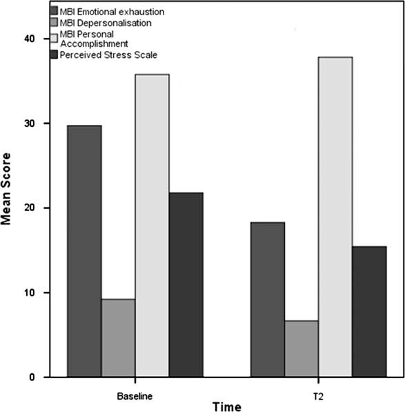 Figure 2 Mean outcome score assessed at baseline and follow-up one month after the course (T2) (all participants). MBI=Maslach Burnout Inventory.