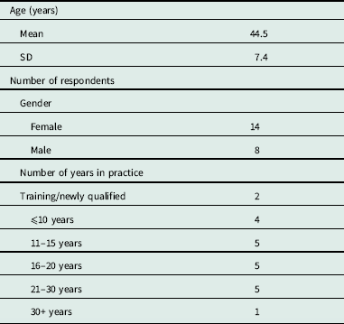 Burnout and stress were measured using the MBI (Maslach and Jackson, Reference Maslach and Jackson1981) and PSS (Cohen et al., Reference Cohen, Kamarck and Mermelstein1983). The MBI consists of 22 questions that assess three aspects of professional burnout syndrome: emotional exhaustion, depersonalization and personal accomplishment. Respondents record how often they experience job-related feelings using a seven-point Likert scale ranging from ‘Never’ to ‘Every day’. Three scores are computed for each respondent, one for each aspect of burnout. The PSS is a validated scale used widely to measure the perception of stress. We used the validated 10-item version. Respondents record how often they felt a certain way during the past month using a five-point Likert scale ranging from ‘Never’ to ‘Very Often’. Higher scores indicate greater perceived stress. Participants were also asked to provide their age, gender and number of years in practice and to respond to open-ended questions on their experiences of the mindfulness course.