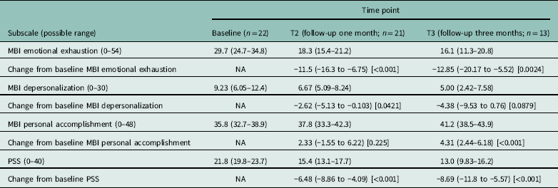 MBI burnout scores of emotional exhaustion and depersonalization were significantly lower at T2 compared with baseline (P<0.001 and P=0.0421, respectively). There was a large change in emotional exhaustion scores during the study, the mean score was 11.5 points lower at T2 compared with baseline (95% confidence interval 6.75–16.3 points). Depersonalization scores also decreased by 2.62 points (95% confidence interval 0.103–5.13) at T2 compared with baseline, and PSS scores at T2 were significantly lower than those seen at baseline (P<0.001); there was a drop of 6.48 points (95% confidence interval 4.09–8.86).