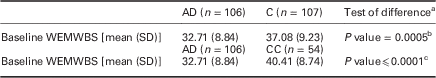 e. Initial WEMWBS score: Table 2 summaries the data. Unpaired t tests were used to assess data. AD was compared with C and then CC. The baselines scores were significantly different between groups, with the greatest difference being between AD and CC. However, each groups’ mean baseline scores were below the 40.5–41.5 and 44.5 cut-off scores found in the Donatella (Reference Donatella2012) paper to correlate highly with likelihood of major depression and depression, respectively. It therefore could be argued that each group is similar at baseline in terms of diagnosis but not in the extent of symptoms.
