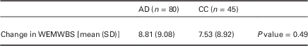 b. Comparison of improvement in WEMWBS between groups: Table 4 displays this data and shows AD compared with CC. An unpaired t test was used to test for difference. There is no significant difference in improvement between the groups as shown in Figure 2.