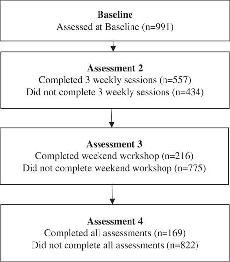 Baseline data were available for 991 participants, of these 254 were male (25.6%) and 737 were female (74.4%). The age of participants ranged from 14 to 80 years and the mean age was 46 years (standard deviation 14.3 years). Pre-treatment mean scores for GAD-7 and PHQ-9 were 10.3 and 10.1, respectively. Scores ranged the full breadth of the scales from 0 to 27 for PHQ-9 and 0 to 21 for GAD-7. At baseline 54% of participants had mild or moderate depression as defined by PHQ-9, and 25% of participants had moderately severe or severe depression. Similarly, 59% of participants had mild or moderate anxiety at baseline and 24% had severe anxiety. Referral data indicated that 689 participants (70.4%) accessed the programme via self-referral, while 179 (18.1%) were referred by a GP and 114 (11.5%) were referred by a counsellor or health professional. There were no obvious differences between these three groups in terms of baseline characteristics. Medication data indicated that 206 participants (20.8%) were taking medications for depression and/or anxiety, while 785 (79.2%) were not. In total 169 participants (17.1%) had complete data at all assessment visits. The number of participants who completed and withdrew from each stage of the programme are shown in the participant flow diagram (Figure 2).