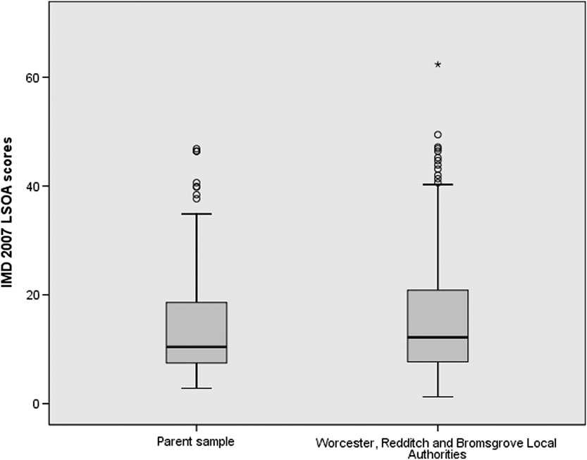 Figure 3 Distribution of index of multiple deprivation 2007 scores: parent sample compared with local area. ○, ⩾1.5* interquartile range distance from upper quartile. *, ⩾3* interquartile range distance from upper quartile value