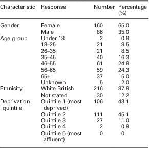 In total, 255 patients were referred to the WHTP during the 21-month pilot period and, of these, 246 went on to commence the health trainer intervention. Others could not be contacted or chose not to continue for unknown reasons. The demographic characteristics of the WHTP patient population are summarised in Table 1. Two-thirds were female and half were aged between 46 and 65 years. The vast majority lived in more deprived areas, while less than 1% lived in the least deprived areas.