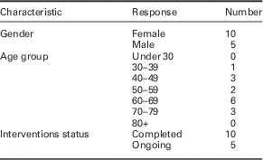 Patients were invited to take part in a focus group at a local community centre to discuss their experiences and perceptions of the programme. Two focus groups (n 1=6 and n 2=4) were conducted, each lasting ~90 min. Participatory appraisal techniques, including ranking exercises and H-diagrams, were used to generate discussion (Tock, Reference Tock2001). The emphasis was on creating a relaxed, informal atmosphere, with a healthy lunch and refreshments provided by a local caterer. One patient chose to attend the same venue for an individual interview, while others (n=4) opted to be interviewed by phone. All discussions were audio-recorded, with participants’ consent and transcribed verbatim to assist with analysis.