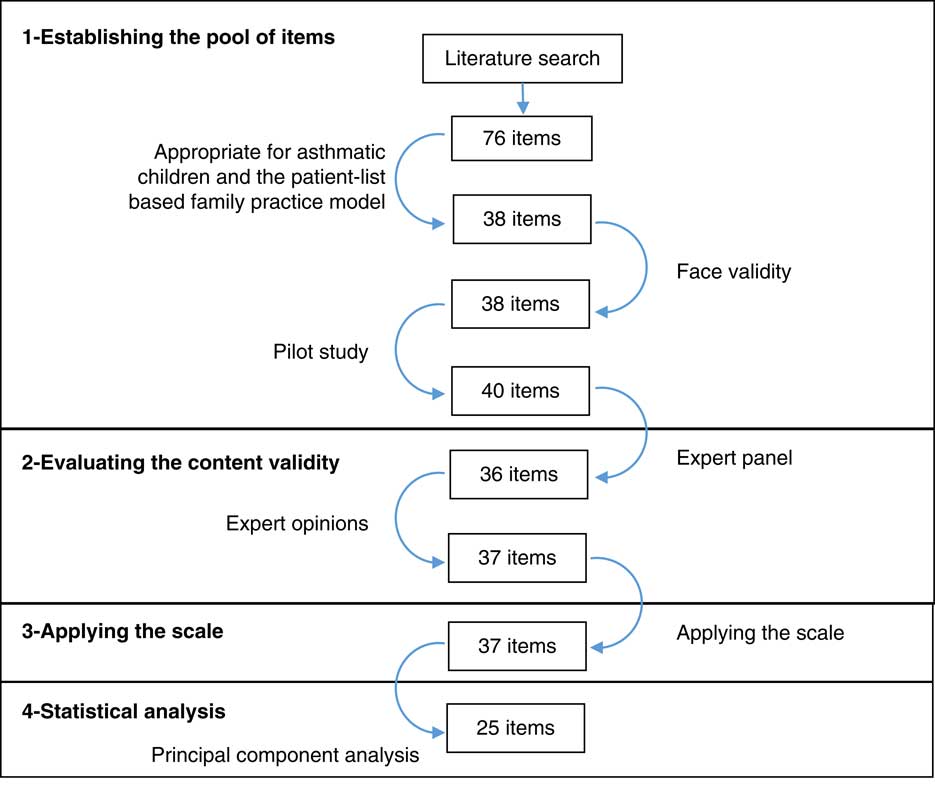 By combining items, statements and questions related the process functions of primary care in the literature, a pool consisted of 76 items was created (Starfield, Reference Starfield1979; Safran et al., Reference Safran, Kosinski, Tarlov, Rogers, Taira, Lieberman and Ware1998; Cassady et al., Reference Cassady, Starfield, Hurtado, Berk, Nanda and Friedenberg2000; Seid et al., Reference Seid, Varni, Bermudez, Zivkovic, Davodi, Nelson and Kurtin2001; Shi et al., Reference Shi, Starfield and Xu2001; Macinko et al., Reference Macinko, Almeida and de Sá2007; Mead et al., Reference Mead, Bower and Roland2008; Lee et al., Reference Lee, Choi, Sung, Kim, Chung, Kim, Jeon and Park2009; Diedhiou et al., Reference Diedhiou, Probst, Hardin, Martin and Xirasagar2010; Schafer et al., Reference Schafer, Boerma, Kringos, De Maeseneer, Greß, Heinemann, Rotar-Pavlic, Seghieri, Svab, Van den Berg, Vainieri, Westert, Willems and Groenewegen2011; Rocha et al., Reference Rocha, Rodriguez-Sanz, Pasarin, Berra, Gotsens and Borrell2012; Yang et al., Reference Yang, Shi, Lebrun, Zhou, Liu and Wang2013; Wang et al., Reference Wang, Shi, Yin, Lai, Maitland and Nicholas2014; Kringos et al., Reference Kringos, Boerma, Hutchinson and Saltman2015; Wei et al., Reference Wei, Li, Yang, Wong, Owolabi, Xu, Shi, Tang, Li and Griffiths2015; Mei et al., Reference Mei, Liang, Shi, Zhao, Wang and Kuang2016). A group of specialists, including the investigator and three public health specialists, evaluated the appropriateness of these items for asthmatic children and the patient-list-based family practice model. All of the existing questionnaires and scales were on general health needs and not developed specifically for childhood asthma. In particular, there were 11 general items not related to asthmatic children but related to comprehensiveness function such as cancer prevention and screening, family planning and drug/alcohol counseling. In addition, there were 27 duplicate items. After these items were removed, 38 new Turkish sentences were generated based on the remaining 38 items and evaluated for face validity. After a pilot study with five mothers who have children with asthma, two more items were added.
