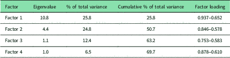 The data set consisting of 320 children was analyzed. There were no missing data. The Cronbach’s α coefficient was calculated to determine the reliability of the scale; the split half (calculation of Spearman–Brown coefficient) and item-total correlation method were used; and the changes in all means or the reliability coefficients if an item deleted were evaluated. Exploratory factor analysis (principal component analysis) was used to determine the construct validity of the scale. The varimax rotation method, an orthogonal rotation method, was applied; Bartlett’s sphericity test P-value, Kaiser–Meyer–Olkin (KMO) value and the measure of sampling adequacy (MSA) were calculated. An eigenvalue >1.0 was used as the criterion for determining the number of factors. Factor loadings were required to be >0.4 and the items with factor loading difference of 0.1 or below under multiple factors were removed from analysis (Field, Reference Field2005).