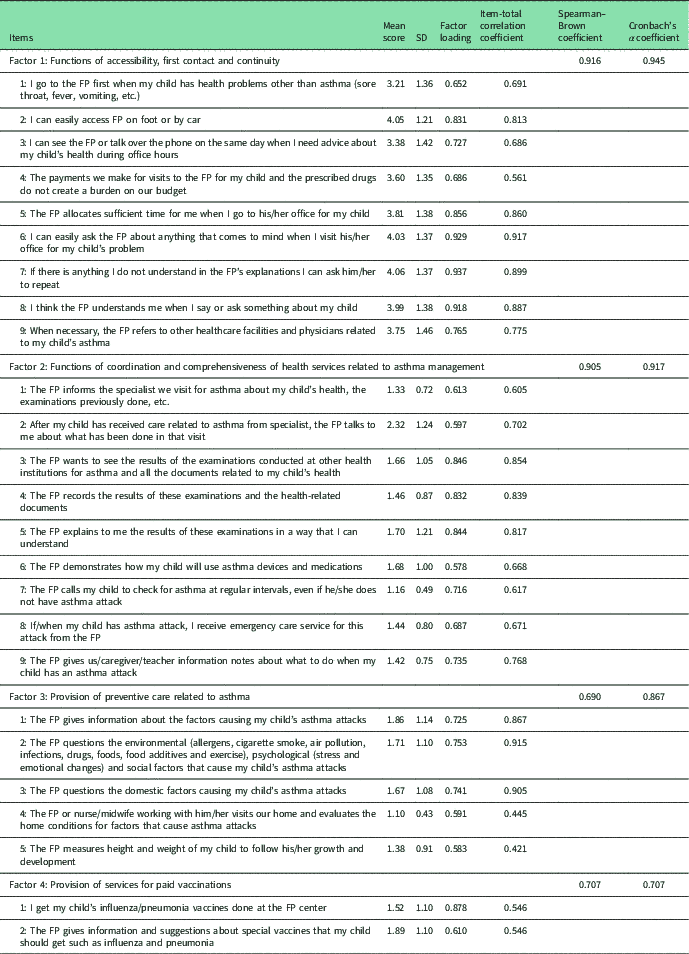 Table 2 Items related to the factors of the Primary Care Functions of Family Physicians in Childhood Asthma scale and analysis results for the items