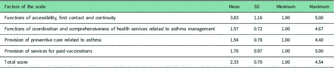 Primary care assessment scales adapted to various languages are not suitable to adequately address the needs of special patient groups, such as children with asthma. None of them contain items about preventive care related to asthma such as questioning the environmental, psychological and social factors causing child’s asthma attacks and evaluating home conditions for these factors or giving instructive information notes about what to do when child has an asthma attack (Safran et al., Reference Safran, Kosinski, Tarlov, Rogers, Taira, Lieberman and Ware1998; Cassady et al., Reference Cassady, Starfield, Hurtado, Berk, Nanda and Friedenberg2000; Seid et al., Reference Seid, Varni, Bermudez, Zivkovic, Davodi, Nelson and Kurtin2001; Shi et al., Reference Shi, Starfield and Xu2001; Mead et al., Reference Mead, Bower and Roland2008; Lee et al., Reference Lee, Choi, Sung, Kim, Chung, Kim, Jeon and Park2009; Rocha et al., Reference Rocha, Rodriguez-Sanz, Pasarin, Berra, Gotsens and Borrell2012; Yang et al., Reference Yang, Shi, Lebrun, Zhou, Liu and Wang2013; Wang et al., Reference Wang, Shi, Yin, Lai, Maitland and Nicholas2014; Mei et al., Reference Mei, Liang, Shi, Zhao, Wang and Kuang2016).
