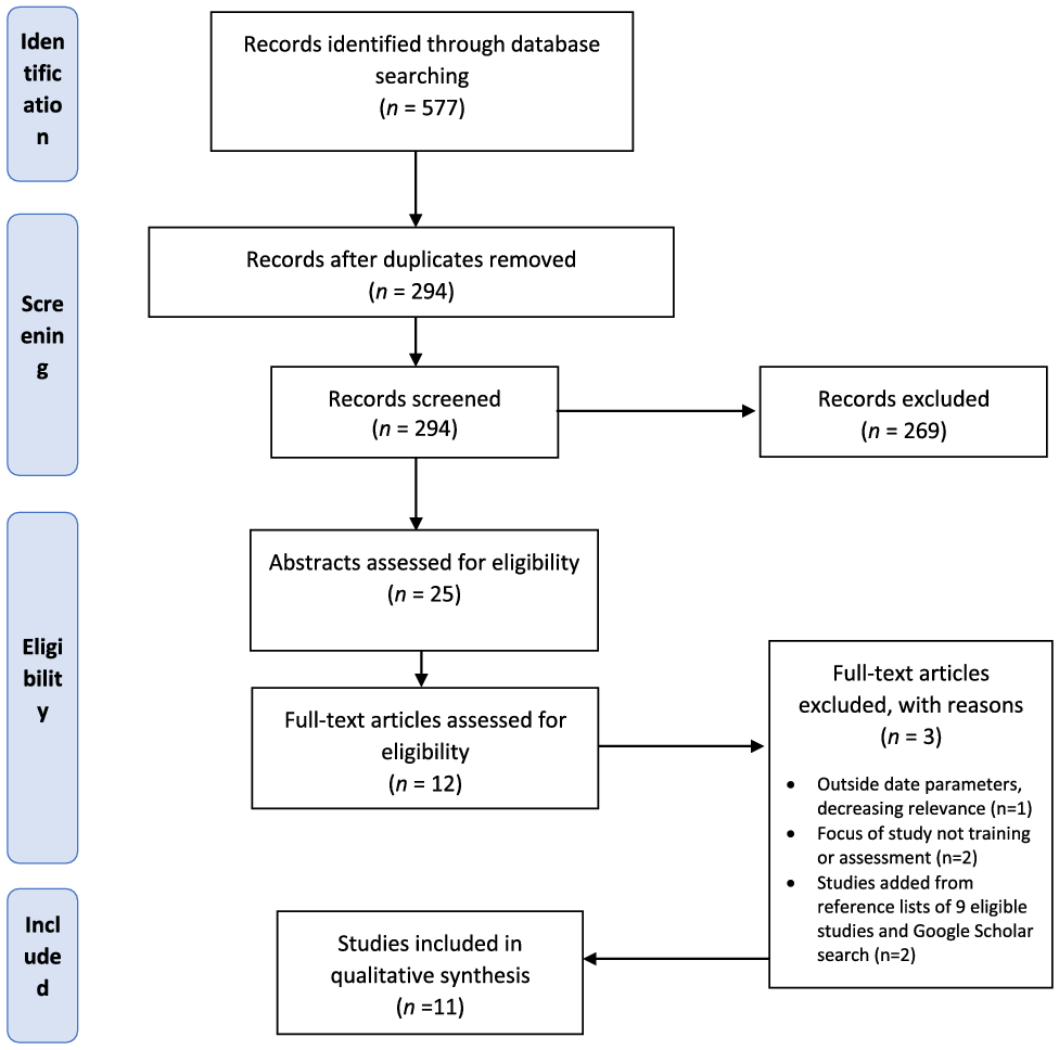 From the seven databases, 577 results were retrieved and exported to EndNote®. After automatic and manual removal of duplicates, 294 records remained. The titles and abstracts of these records were assessed against the inclusion criteria listed above. Of the 294 records assessed, 25 were retained for abstract review. An online software platform, Covidence®, was used to facilitate this review process. All abstracts and metadata were imported into Covidence® to facilitate the implementation of the PRISMA-ScR screening approach (see Figure 1). Of the 12 articles remaining after abstract screening, three were excluded after full-text review. Two further studies were added after reviewing the reference lists of the nine eligible articles and conducting a Google Scholar search for completeness, for a total of 11 articles included in this review. A single author (SY) screening process was used for the title/abstract screening, and three authors (SY, SP, MB) participated in the full-text review process. The validity of the papers included in the full-text review was assessed against the eligibility criteria: