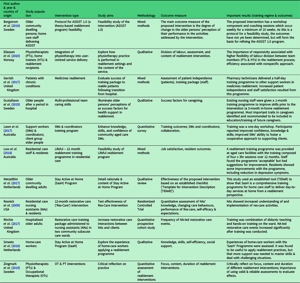 While the reablement training was evaluated as the only outcome measure in four studies (Resnick et al., Reference Resnick, Gruber-Baldini, Galik, Pretzer-Aboff, Russ, Hebel and Zimmerman2009; Lawn et al., Reference Lawn, Westwood, Jordans, Zabeen and O’Connor2017; Ritchie et al., Reference Ritchie, Wood, Martin and Jones2017; Smeets et al., Reference Smeets, Kempen, Zijlstra, van Rossum, de Man-van Ginkel, Hanssen and Metzelthin2019), in two studies (Gerrish et al., Reference Gerrish, Laker, Wright and Stainrod2017; Low et al., Reference Low, Venkatesh, Clemson, Merom, Casey and Brodaty2018), the outcome measures included both the reablement training evaluation and a measure of the reablement outcomes, for example assessment of clients. One study (Bergstrom et al., Reference Bergstrom, Borell, Meijer and Guidetti2019) included client capabilities as the only outcome measure.