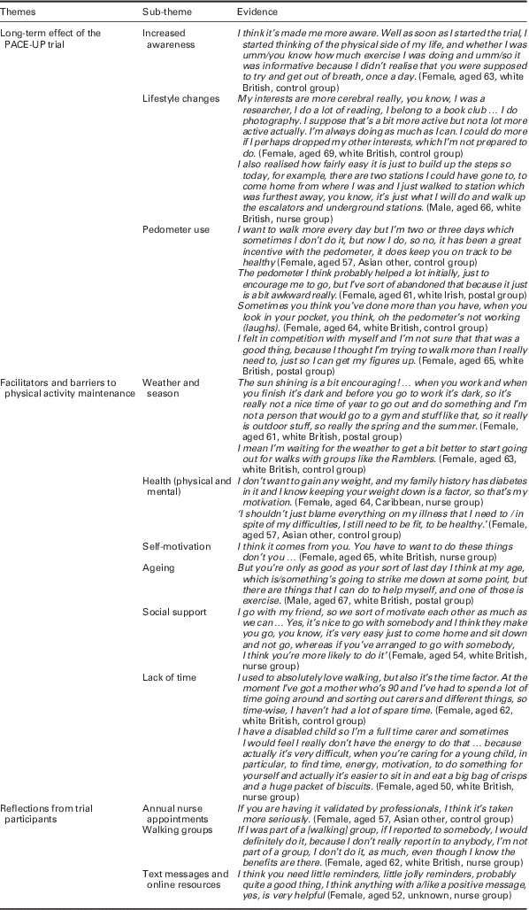 Limitations of this research should also be acknowledged. The PACE-UP trial, from which the participants were sampled, was conducted in South West London. Although a diverse area in terms of ethnicity and SES, care should be taken when transferring the findings to a wider context, especially as those interviewed were mostly Caucasian. As with all research, our findings only represent the views of those who consented to be contacted. Whilst we made contact with those declining to participate in the PACE-UP main trial to explore reasons for non-participation (Normansell et al., Reference Normansell, Holmes, Victor, Cook, Kerry, Iliffe, Ussher, Fox-Rushby, Whincup and Harris2016), we did not attempt to contact those declining to take part in the three-year follow-up. Our findings therefore only represent those participants that continued with the PACE-UP trial at three years. Participants who did not consent to be interviewed or who dropped out from the follow-up might have differing views and issues surrounding PA maintenance that we were unable to capture. Our exploratory between-group comparisons may also be limited by contamination of the control group after 12 months following all participants being offered a PA intervention.