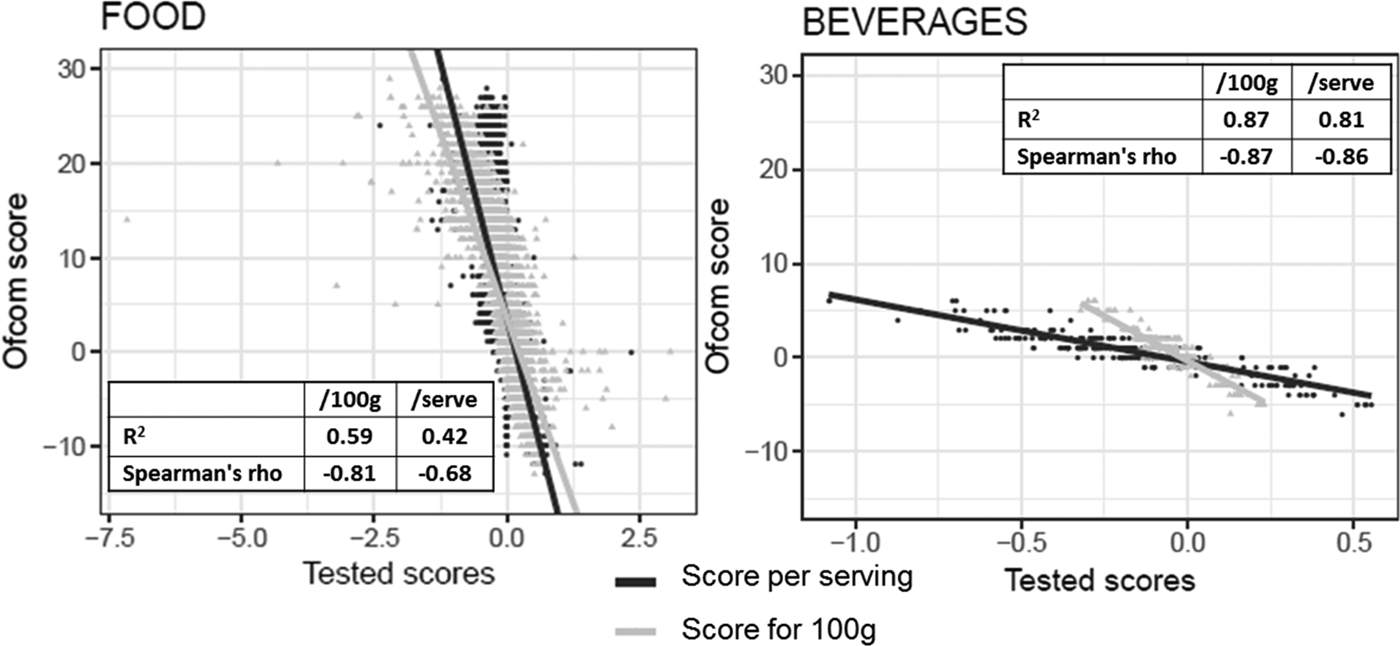 Figure. Correlation between the tested and the Ofcom scores, for food and beverages.
