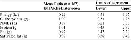 The accuracy of estimation of nutrient intakes using INTAKE24 was calculated as a ratio by dividing each participant's estimated nutrient intake from INTAKE24 by the estimated intake from the interviewer-led recall. A ratio of less than 1 indicates an under-estimation of intake using INTAKE24 compared with the interviewer-led recall and above 1 represents an over-estimation. The closer the ratio to 1, the more accurate the estimate. The table below indicates the relative accuracy of the online tool. Limits of agreement were applied so that 95 % of the differences would lie between the limits.
