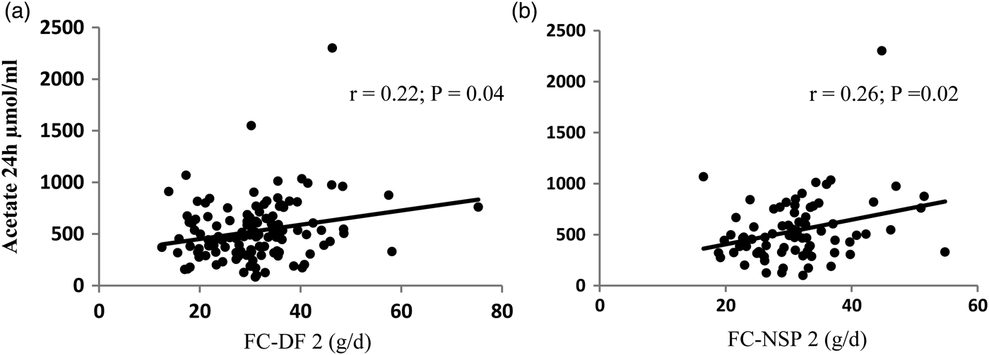 Fig. 1. Correlation of FC-DF2 (A) and FC-NSP2 (B) and 24 h urinary excretion of acetate