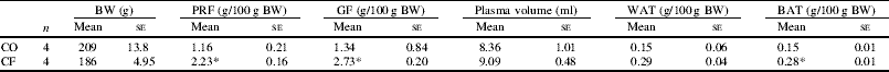 Wistar rats (4 weeks old) were fed either chow diet alone (n 4), as a control group (CO), or chow with cafeteria diet (n 4), as the experimental group (CF), for 6 weeks before mating and through to day 5 of gestation. The cafeteria diet consisted of highly-palatable human foods (cheese, chocolate, biscuits, pork pie, sausages, pate, peanuts, crisps, golden syrup cake and jam). The CF group was given four of these junk foods daily and the same food was not given for >2 d in order to maintain an attractive variety. Food intakes and body weights were measured in both groups daily. After 6 weeks all rats were mated and maintained on the same diets until day 5 of gestation. At this point the maternal plasma volume was determined through the intravenous infusion of Evans blue dye under terminal anaesthesia. Gonadal and perirenal fat pads were weighed after each animal was killed.