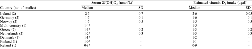 Median concentrations of serum 25(OH)D2 ranged from 0·8–2·5 nmol/L in these European populations, while median vitamin D2 intakes were estimated to be in the range 0·9–2·6 µg/day (see table), with Ireland having the highest estimated median intake of 2·6 µg/day. In conclusion, based on serum 25(OH)D2 concentration data, European populations have exposure to vitamin D2 in their diet. The exact dietary sources of vitamin D2 in the European food chain needs to be investigated.