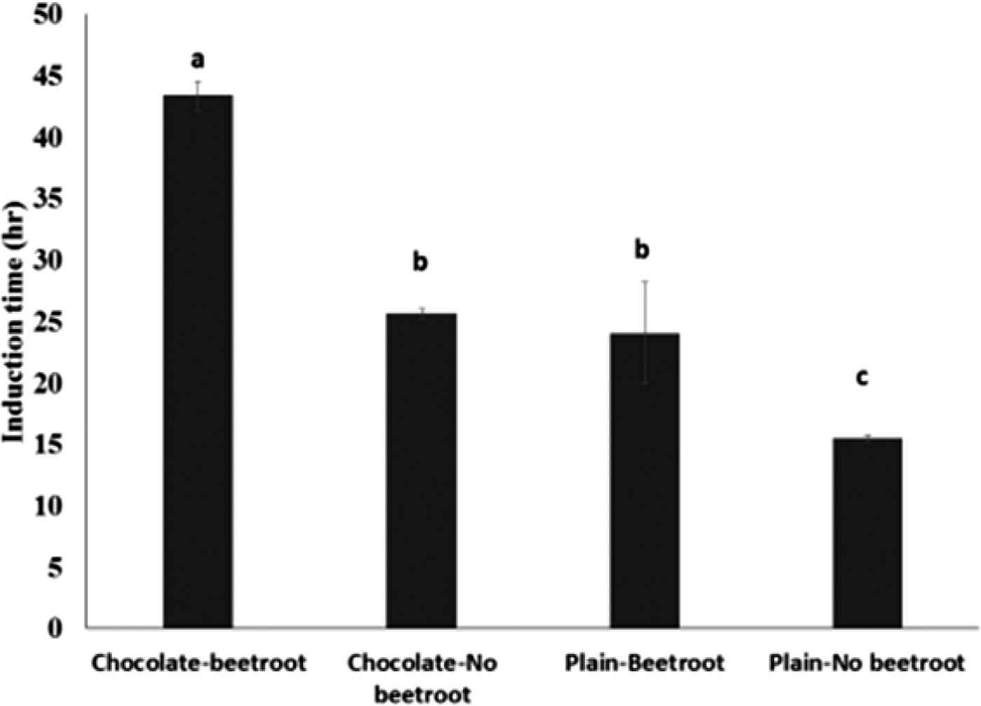 Adding beetroot significantly improved the nutritional profile, antioxidant potential and polyphenol content of the cakes (P < 0·001) (Figure 1) without significantly affecting sensory properties (P > 0·05). The CB cake demonstrated the greatest oxidative stability and shelf life while PN showed the lowest (P < 0·05) (Figure 2). The PN cake produced a significantly higher TBARS content during digestion (P < 0·001), and chocolate appeared to have a greater impact on their attenuation than beetroot. Conversely, the chocolate cakes generated significantly higher amounts of Protein carbonyls during digestion (P = 0·001). The textural properties of fresh cake were not affected by the addition of beetroot (P > 0·05). The hardness of all the cakes increased with storage but did not significantly differ between the four cake types.