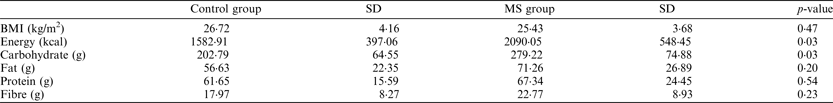 The energy intake in the MS group was significantly higher than the control (p < 0·05) and this was highlighted further when correcting for body mass (kg). However, BMI was not significantly different between the two groups. Total carbohydrate intake (g) was significantly higher in the MS group (p < 0·05) with percentage of carbohydrate above the DRV(Reference Whitton4) and fat and protein below. This increase in carbohydrate was highlighted by an increase in fructose, glucose, sucrose and total sugars (p < 0·05) in the MS group compared to the control group. There was no difference in micronutrients, fibre or food group consumption.