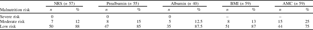 Of the eight patients having two or more anthropometric measurements consistent with malnutrition, four (50%) also had low prealbumin (100–170 mg/l). Not all the patients had albumin measured as they were not deemed to be malnourished by the admitting team. Two of these patients with low prealbumin had normal albumin. The NRS failed to identify these patients. One patient with normal anthropometric measurements had a high NRS and both prealbumin and albumin levels were low (this patient died in hospital), but otherwise there was no correlation between NRS and the biochemical markers.