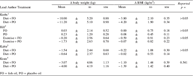 A search of the literature was conducted using Web of Science, PubMed, Medline and Google Scholar for studies having the keywords ‘fish’, ‘fish oil’, ‘oily fish’, ‘omega three’, ‘omega-3’, ‘n-3’, ‘body weight’, ‘body composition’, ‘BMI’, ‘weight reduction’ or ‘weight loss’. Extensive cross referencing searches were also performed and published abstracts were evaluated for inclusion. The initial search revealed fifteen studies. Studies were excluded if they were not randomised controlled trials, had not compared the effect of fish oil supplementation with another (non-n-3) oil control, had not used overweight or obese subjects and had not taken pre- and post-intervention measurements of body weight and BMI; six studies were rejected. Requests for data were only accepted from four research groups. Mean values of pre- and post-intervention body weight (kg) and BMI (kg/m2) were calculated along with the standard deviation and standard error of the mean values. Δ change from baseline and the Δ difference between body weight and BMI changes were also calculated.