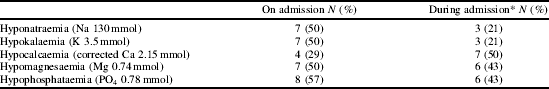 Electrolyte changes were common (Table 1). Seven patients showed impaired renal function and 11 showed impaired liver function. Four patients developed severe infection (three pneumonia, one C Diff), showing paradoxical changes in infective markers. Three of these were hypothermic (<35°C), two were neutropenic (WCC <0.5) and all four were severely hypoglycaemic (BM<1.6).