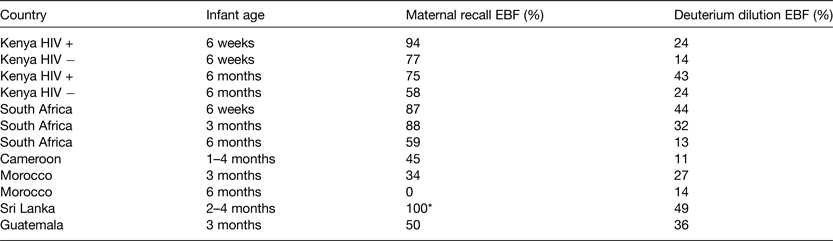 The World Health Assembly target is to increase the rate of EBF in the first 6 months up to at least 50 % by 2025. Hitherto data on EBF patterns are derived from maternal recall during routine demographic health surveys. Recent work in IAEA member states (Sri Lanka( Reference Bandara, Hettiarachchi and Liyanage 14 ), Cameroon( Reference Medoua, Sajo Nana and Ndzana 15 ), Kenya( Reference Oiye 16 ), Morocco( Reference Choua, El Kari and El Haloui 17 ), South Africa( Reference Mulol and Coutsoudis 18 ) and Guatemala( Reference Mazariegos, Slater and Ramirez-Zea 19 ) used the dose-to-mother technique to assess EBF compared with maternal recall (based on listing of liquid and food items (normally 11–12 items) and asking the mother whether the infant received any of these since birth or in the 24 h preceding the survey). The studies revealed that compared with the objective deuterium dilution (DD) method, mothers’ own recall of EBF is biased, tending to overestimate by about 40 % at 3–6 months of age (Table 1).