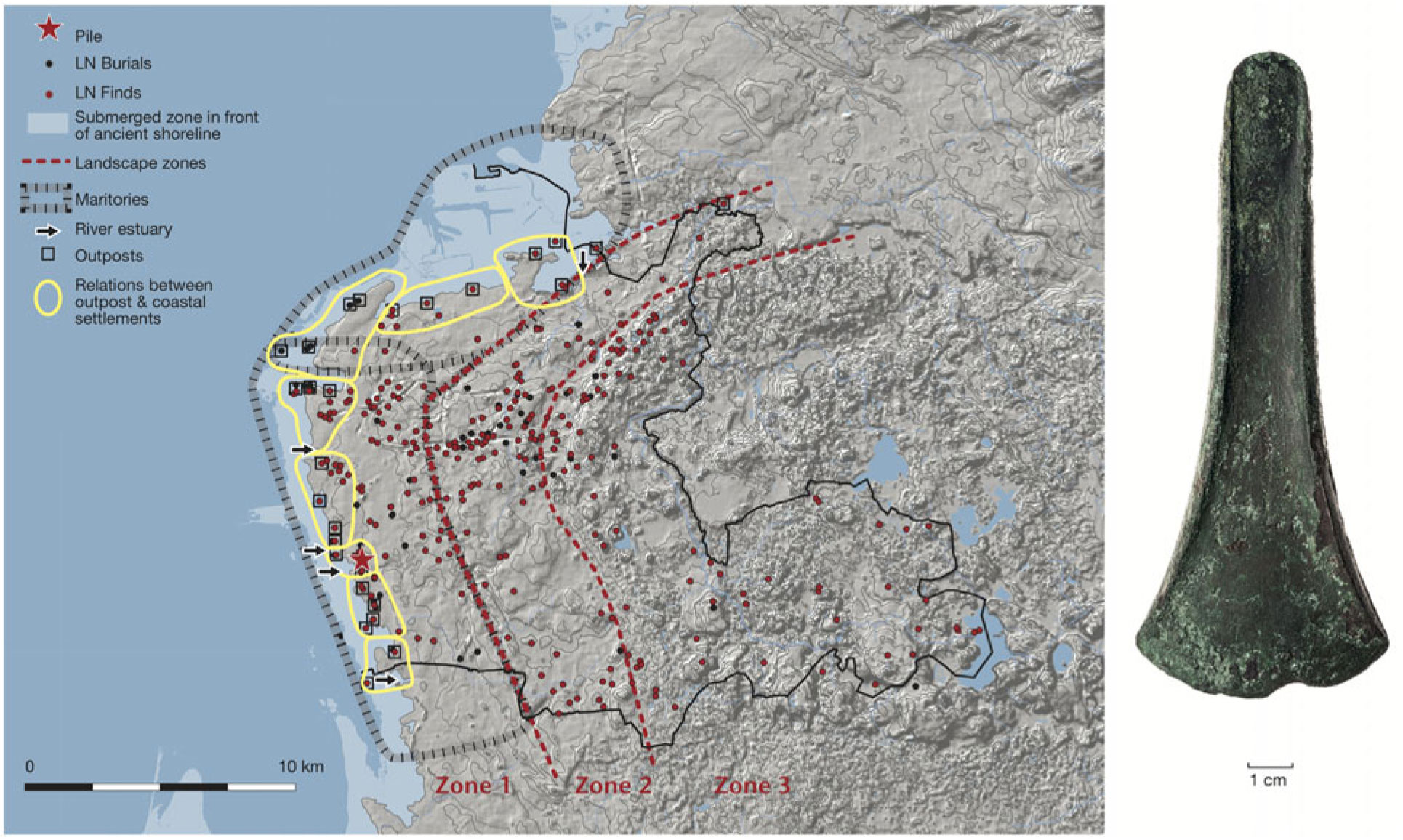 Fig. 10. Pile in its local context of south-west Scania. The suggested micro-maritory organisation of the three zones of coastal landscape in south-west Scania around 2000 bc. This map strongly indicates the archipelago character of the outer coastland colonised around this time. The longhouse village of Almhov lies a mere 6 km north of Pile. Effective metal axes may explain the construction of such timber-demanding longhouses (after Vandkilde 2017a, 51, fig. 27, 68, fig. 36B; photo: Ola Myrin, The Swedish History Museum; graphics by Unit of Archaeological IT AU Moesgaard)