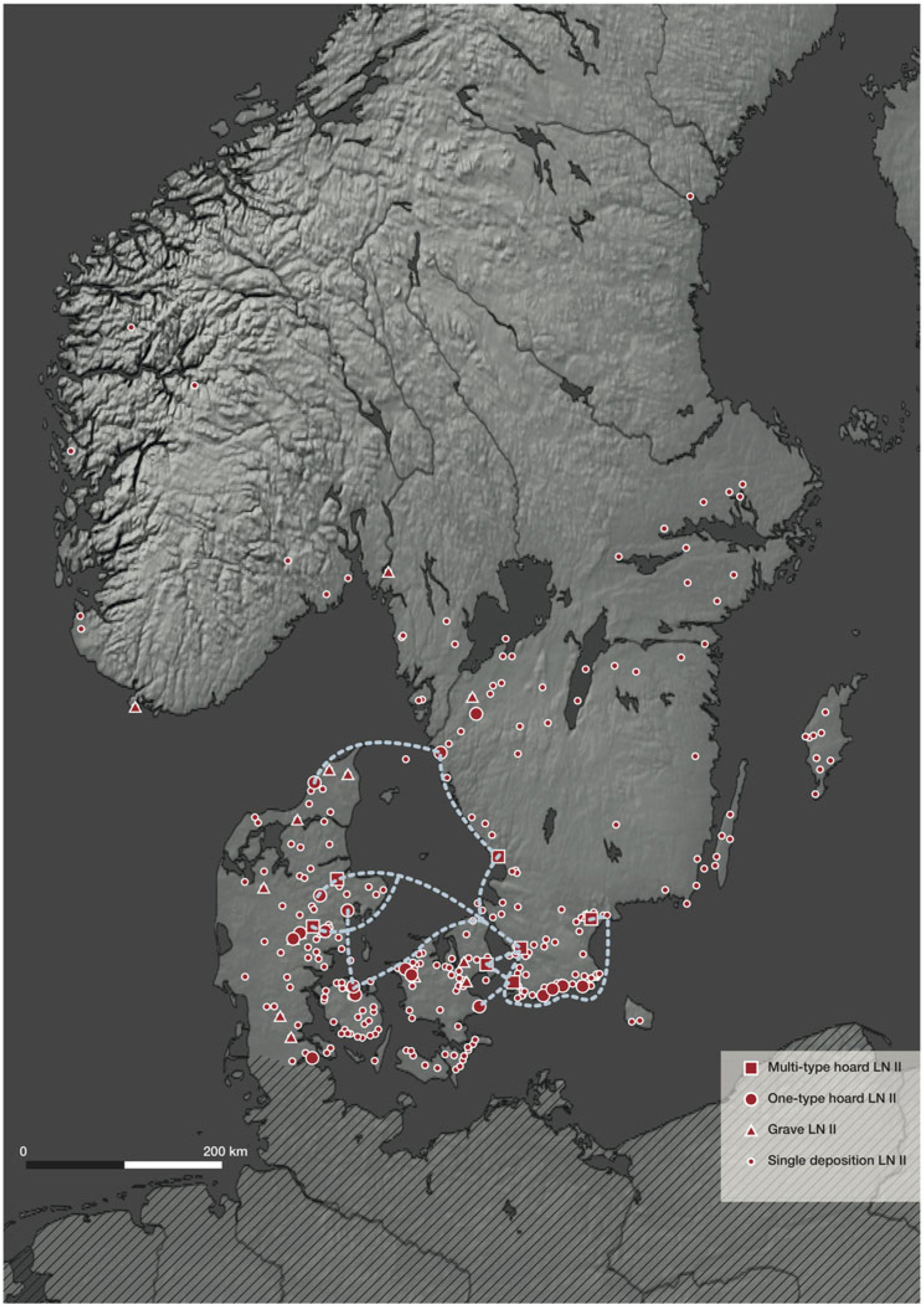 Fig. 11. Pile in its regional context of Scania with at least five other hoard sites. Each may deserve to be called a metalworking port, an entrepôt. Their coastal location, associated with relatively calm waters, may indicate that they provided metals from across the Baltic Sea. The connecting routes crossed the Baltic Sea, but also went along the Scanian coast and towards the interior of the region, as the wide distribution of local Pile-type axes and other typical Late Neolithic culture may show (after Vandkilde 2017a, 171, fig. 102; graphics by Unit of Archaeological IT AU Moesgaard)