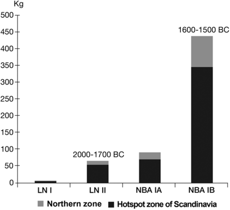 Fig. 15. Based on metal weight per hundred year, this histogram demonstrates the increase in metal consumption c. 2400–1500 bc. Southern Scandinavia emerges as the metallurgical hotspot of Scandinavia during the entire period. The time of Pile marks the first distinct increase in the availability of metal due to the metallurgical consolidation that took place. This correlates broadly with the initial phase of bronzisation in the Bronze Age hyper-region (cf. Fig. 1). In 1600 bc, a much more distinct benchmark emerged, that being the development of the NBA as a cultural zone in its own right. The 1600 bc threshold corresponds to the beginning of an expansion seen globally throughout the hyper-region, giving rise to mining activities of industrial proportions (after Vandkilde Reference Vandkilde2017a, 153, fig. 93; © Helle Vandkilde)