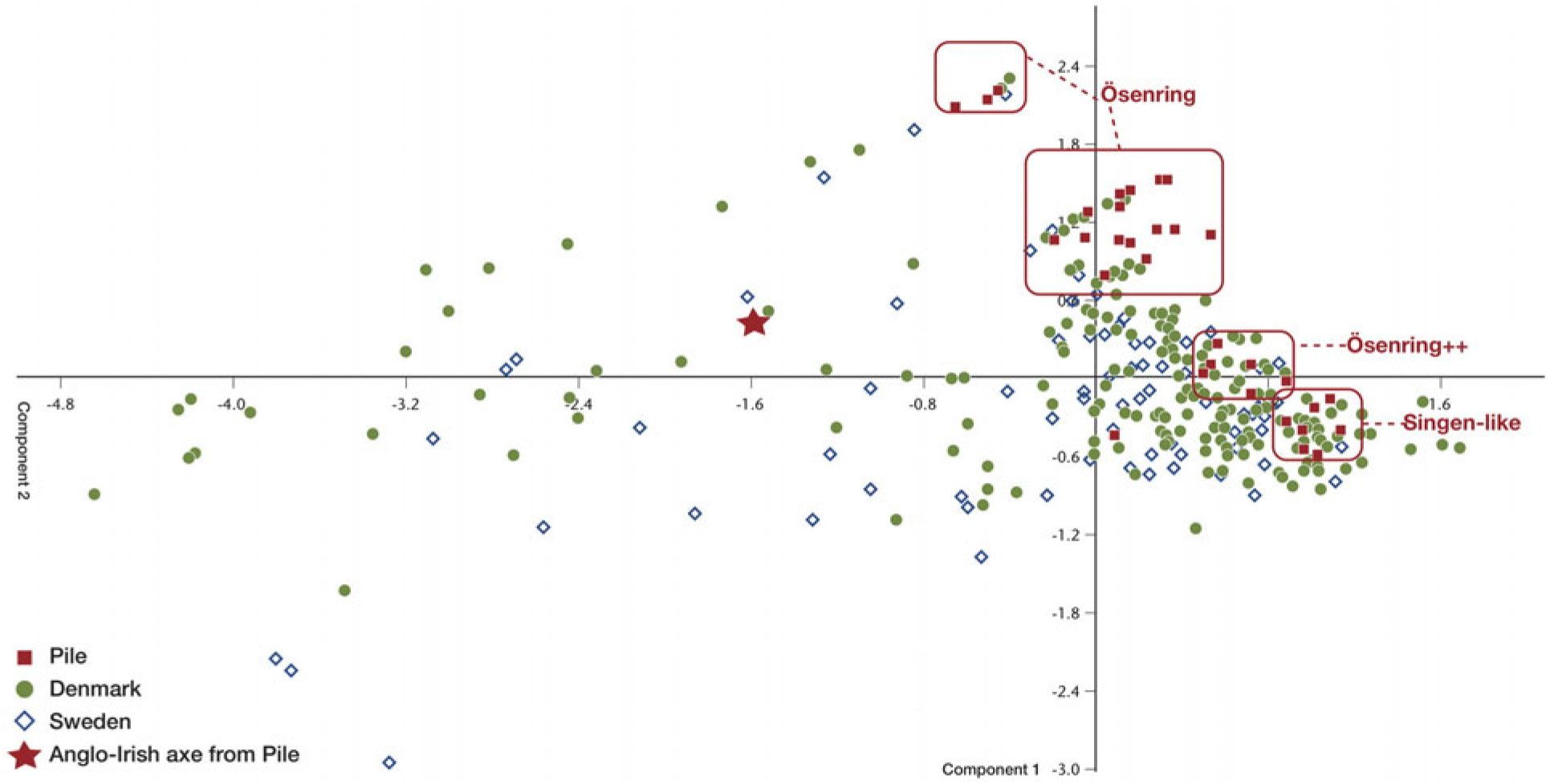 Fig. 8. PCA plot. Metal compositions at Pile are condensed in their trace elemental components when compared to the wider spread of contemporaneous metal analyses/objects from Denmark and Sweden (318 analyses). This condensed pattern recurs when plotting data for other hoards. This may indicate that the hoards represent a relatively brief period of metalworking before the objects were deposited soon after the metal’s arrival. In many cases, the outliers are British axes, which plot very differently than the predominant fahlore copper used (after Vandkilde 2017a, 138, fig. 81; © Helle Vandkilde)